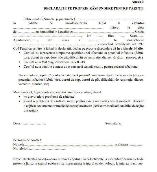 Completând această declarație, părintele se obligă să respecte măsurile de protecție impuse, să. Conform noilor reguli, după ora 23.00 se poate ieși din casă doar cu declarație pe propria răspundere sau adeverință de la angajator, purtarea măștii devine obligatorie peste tot în spațiile. Modelul declaraţiei pe proprie răspundere a fost actualizat, a anunţat, joi, grupul de comunicare strategică. Părinţii trebuie să semneze declaraţia pe propria răspundere, cunoscând prevederile art. Este aceeași declarație, pentru că motivele rămân cele valabile și acum (n.r.